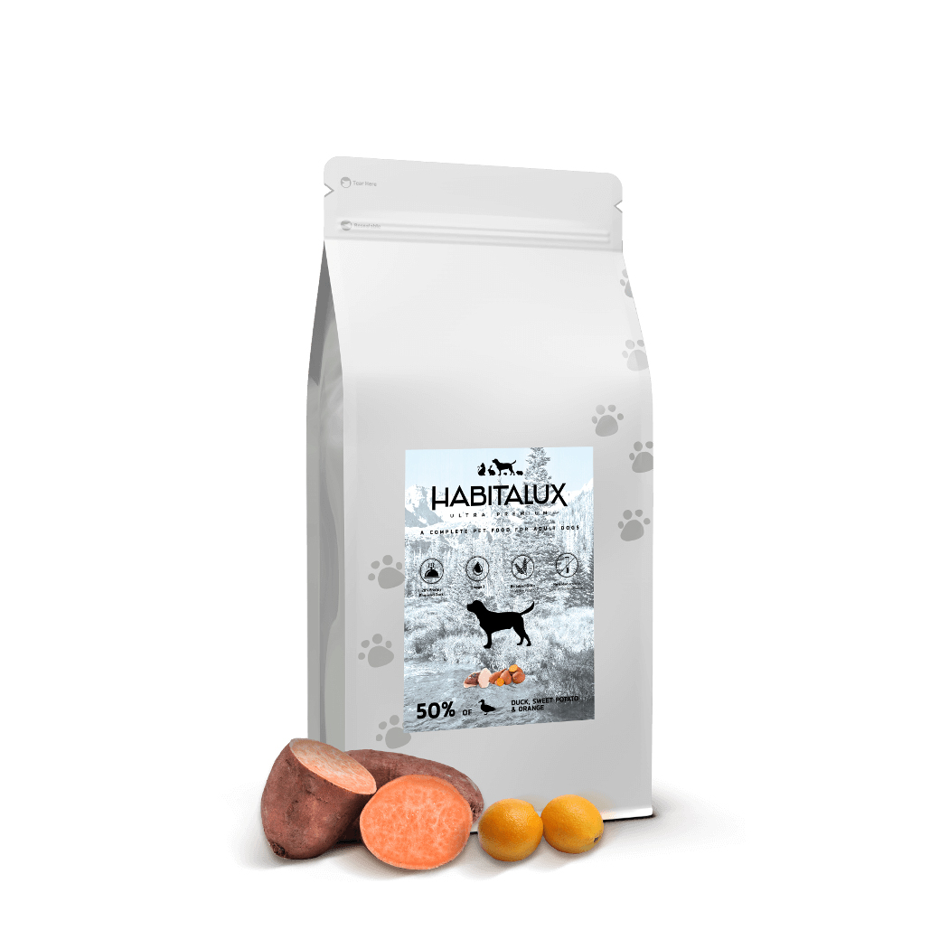 Kaczka 50% (w tym 28% świeżo przygotowanej kaczki, 20% suszonej kaczki i 2% wywaru z kaczki), bataty (26%), groszek, ziemniaki (8%), pulpa buraczana, siemię lniane, suplement Omega 3, witaminy i minerały, wywar z warzyw, pomarańcze (odpowiednio 7.5g na 1 kg produktu), żurawina, frukto-oligosacharydy (92 mg/kg), manno-oligosacharydy (23 mg/kg).
