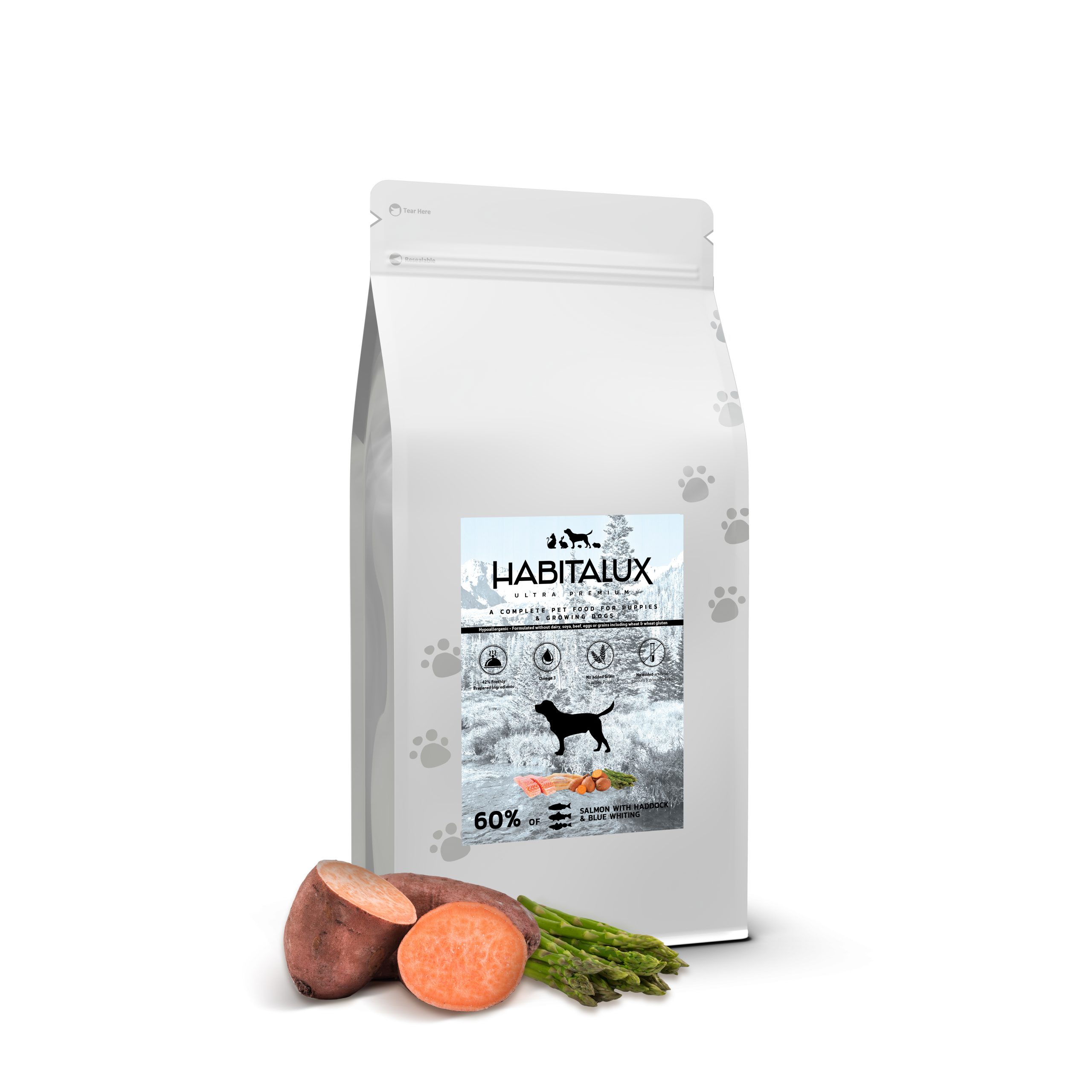 Pstrąg i łosoś 50% (w tym świeżo przygotowany pstrąg 30%, suszony łosoś 11%, świeżo przygotowany łosoś 4%, olej z łososia 3%, bulion łososiowy 2%), bataty (24%), ziemniaki, groszek (6%), pulpa buraczana, białko grochu, siemię lniane, białko ziemniaczane, minerały, witaminy, bulion warzywny, szparagi (0,3%), glukozamina (170 mg/kg), metylosulfonylometan (170 mg/kg), siarczan chondroityny (125 mg/kg), FOS (96 mg/kg), MOS (24 mg/kg).